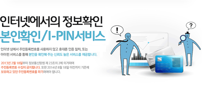 I-PINÀ̶õ ¡°ÀÎÅͳݻóÀÇ °³ÀÎ ½Äº°¹øÈ£(Internet Personal Identification Number)¡° ·Î½á ´ë¸éÈ®ÀÎÀÌ ¾î·Á¿î ¿Â¶óÀλ󿡼­ ¸íÀǵµ¿ëÀÌ ½¬¿î Áֹεî·Ï¹øÈ£¸¦ ´ë½ÅÇÏ¿© º»ÀÎÀÓÀ» È®ÀÎ ¹ÞÀ» ¼ö ÀÖ´Â ½Å¿øÈ®ÀÎ ¼ö´ÜÀÔ´Ï´Ù.