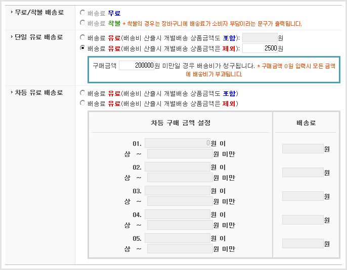 - »óǰ µî·Ï/¼öÁ¤ ÆäÀÌÁö¿¡¼­ °³º° ¹è¼Ûºñ¸¦ »ç¿ëÇÒ °æ¿ì ÇØ´ç »óǰÀº Ãß°¡·Î °³º° ¹è¼Ûºñ°¡ û±¸ µË´Ï´Ù.